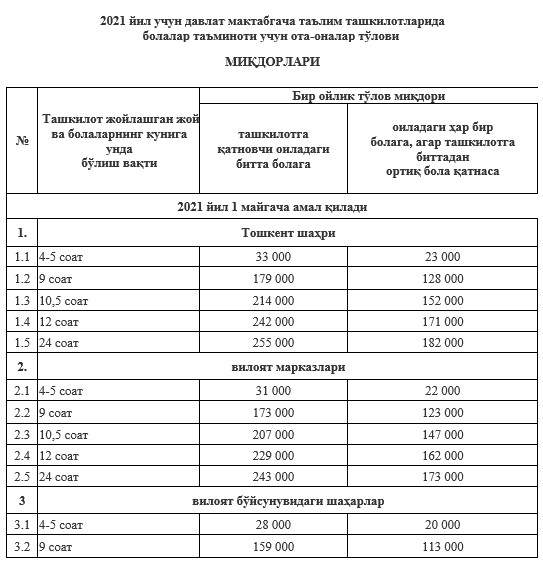 Qarorga ko‘ra 2021 yil uchun davlat maktabgacha ta'lim tashkilotlarida bolalar ta'minoti uchun ota-onalar to‘lovi miqdorlari tasdiqlandi.