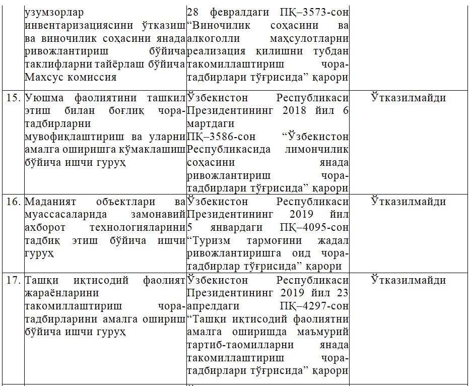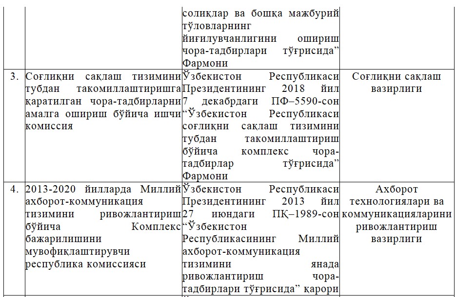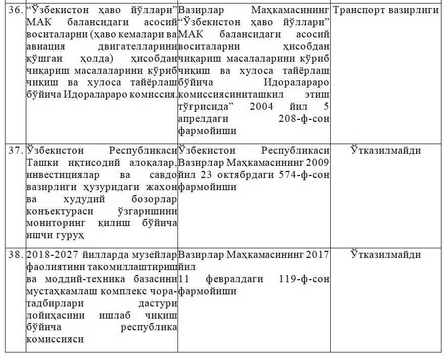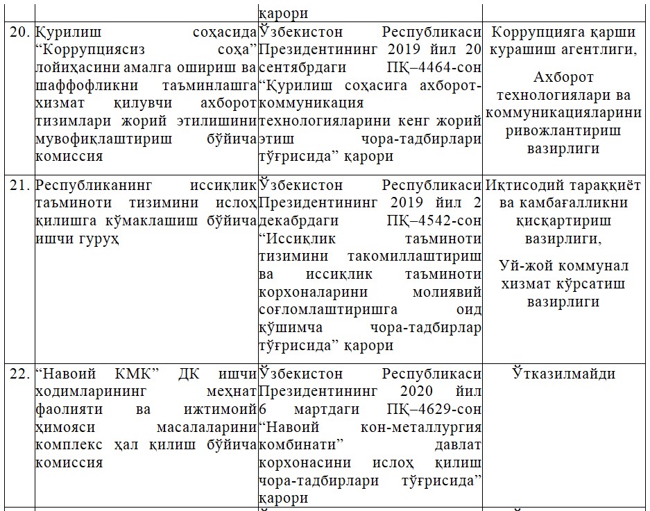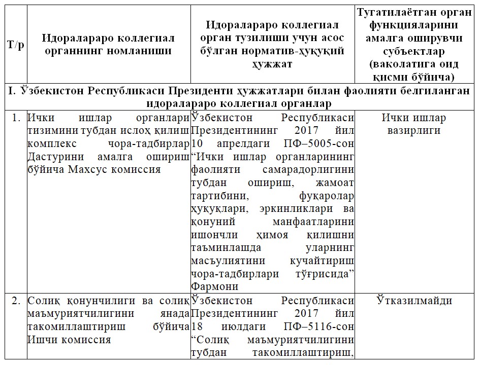 2021 yil 1 yanvardan O‘zbekiston Respublikasi Prezidenti hujjatlari va O‘zbekiston Respublikasi Hukumati qarorlari bilan tuzilgan ayrim idoralararo kollegial organlar ro‘yxatga muvofiq ularning vakolatlari tegishli davlat va xo‘jalik boshqaruvi organlari, mahalliy ijro etuvchi hokimiyat organlari va boshqa tashkilotlarga o‘tkazilgan holda tugatiladi.