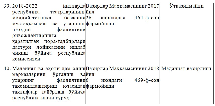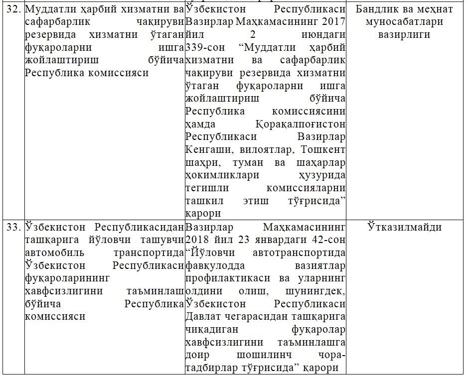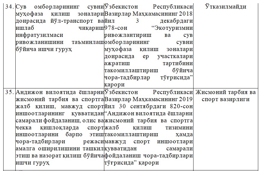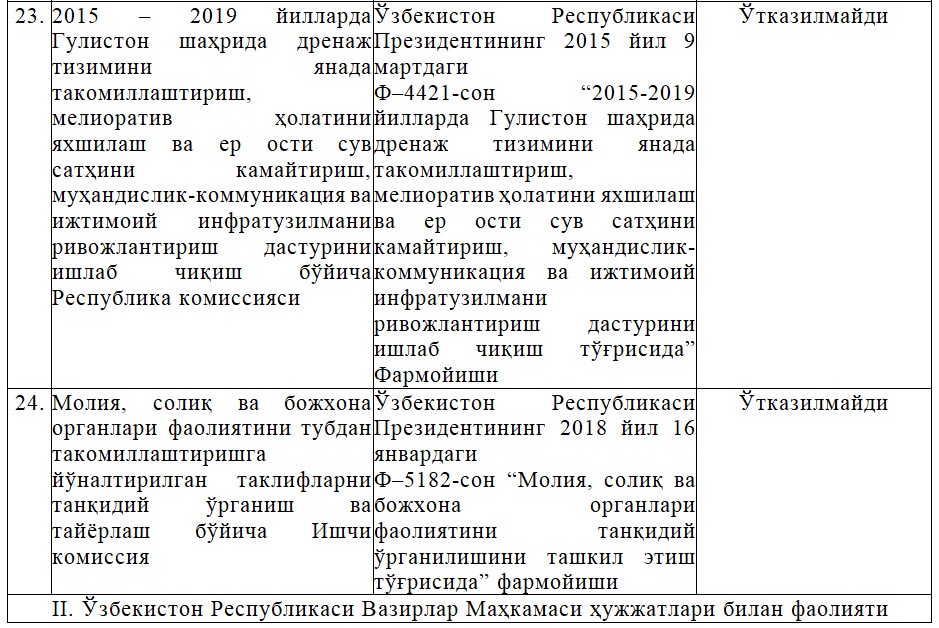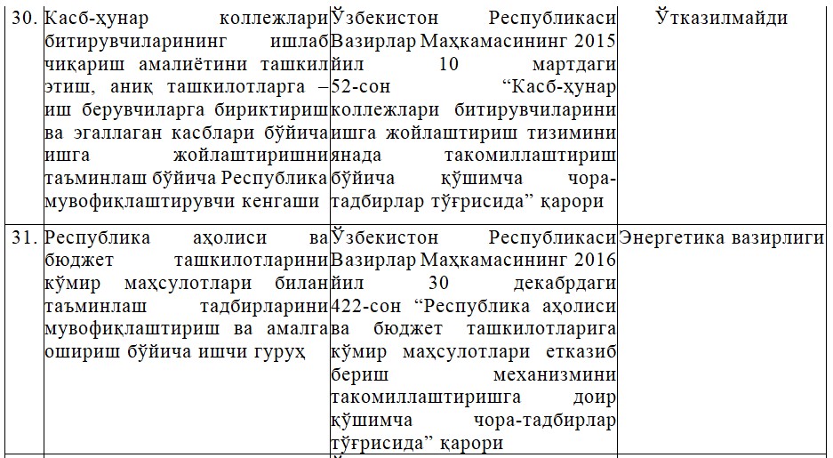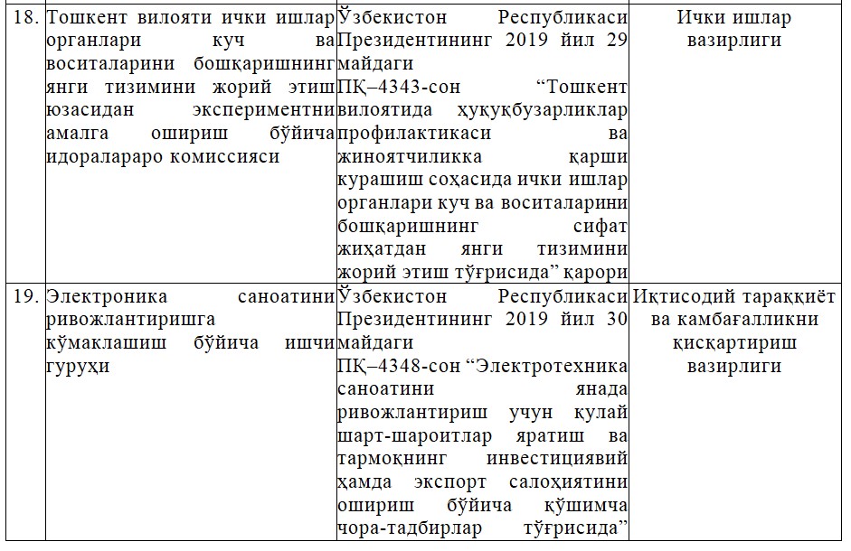 2021 yil 1 yanvardan O‘zbekiston Respublikasi Prezidenti hujjatlari va O‘zbekiston Respublikasi Hukumati qarorlari bilan tuzilgan ayrim idoralararo kollegial organlar ro‘yxatga muvofiq ularning vakolatlari tegishli davlat va xo‘jalik boshqaruvi organlari, mahalliy ijro etuvchi hokimiyat organlari va boshqa tashkilotlarga o‘tkazilgan holda tugatiladi.