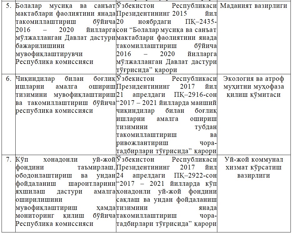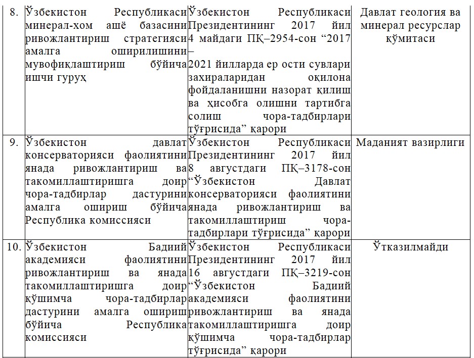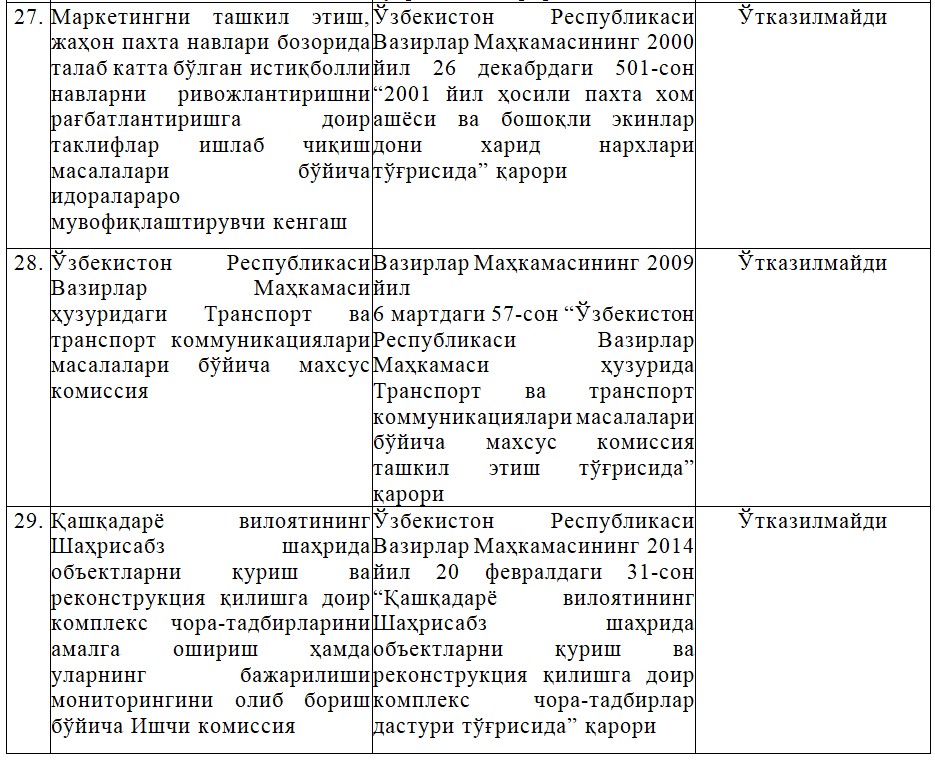 O‘zbekiston Respublikasi Prezidenti hujjatlari va O‘zbekiston Respublikasi Hukumati qarorlari bilan tuzilgan, 2021 yil 1 yanvardan boshlab tugatilayotgan alohida idoralararo kollegial organlar