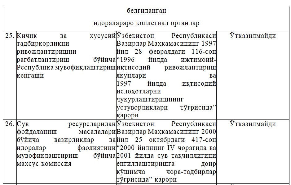 O‘zbekistonda 40ta idoralararo kollegial organ tugatiladi (ro‘yxat)