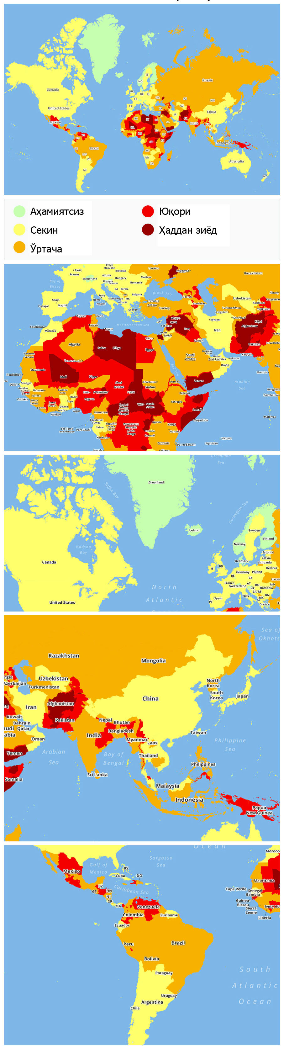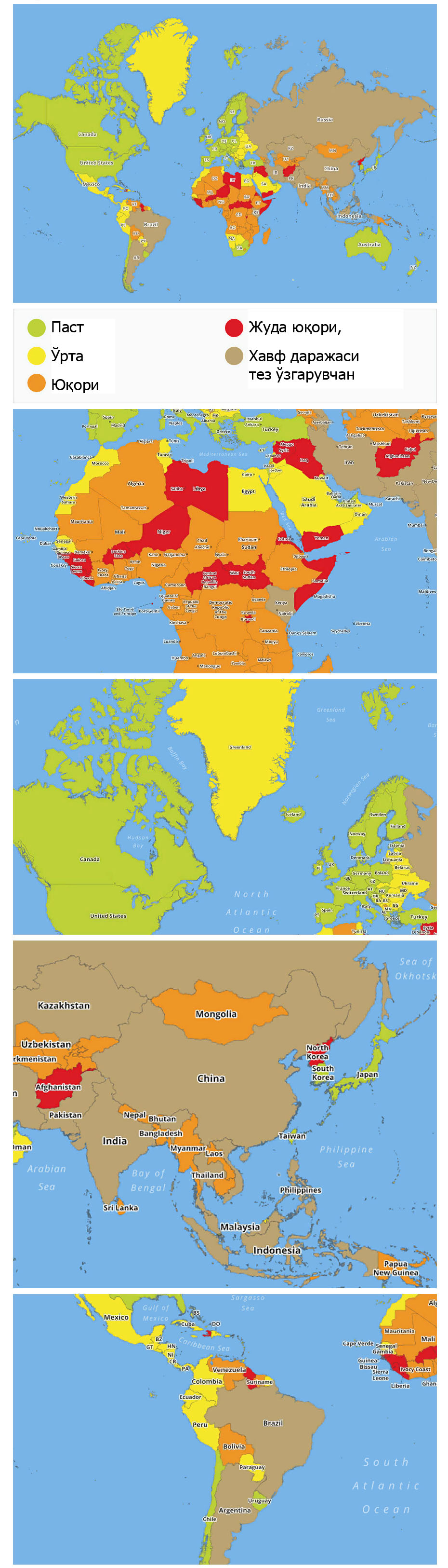 International SOS 2017 yilning noyabr oyi uchun hisobotini taqdim etdi. Tahlil uch yo‘nalishda olib boriladi: tibbiyot, xavfsizlik, yo‘l harakati xavfsizligi. Mamlakatlarning muayyan yo‘nalishlardagi xavf darajasi bir necha qismga taqsimlangan: sekin, o‘rtacha, yuqori, juda yuqori.
