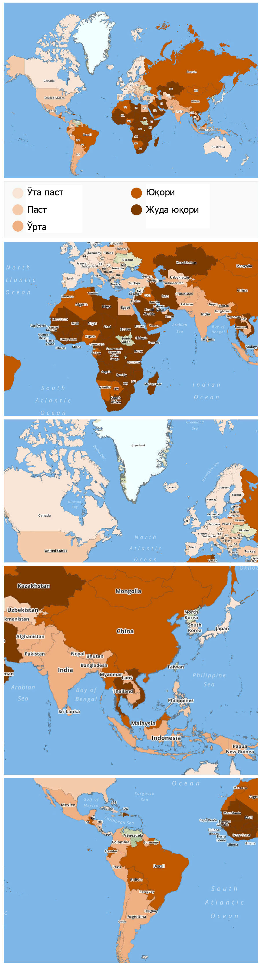 Braziliya, Xitoy, Rossiya va Qozog‘iston tez rivojlanayotgan o‘zgaruvchan xavf ostidagi mamlakatlar hisoblanadi.