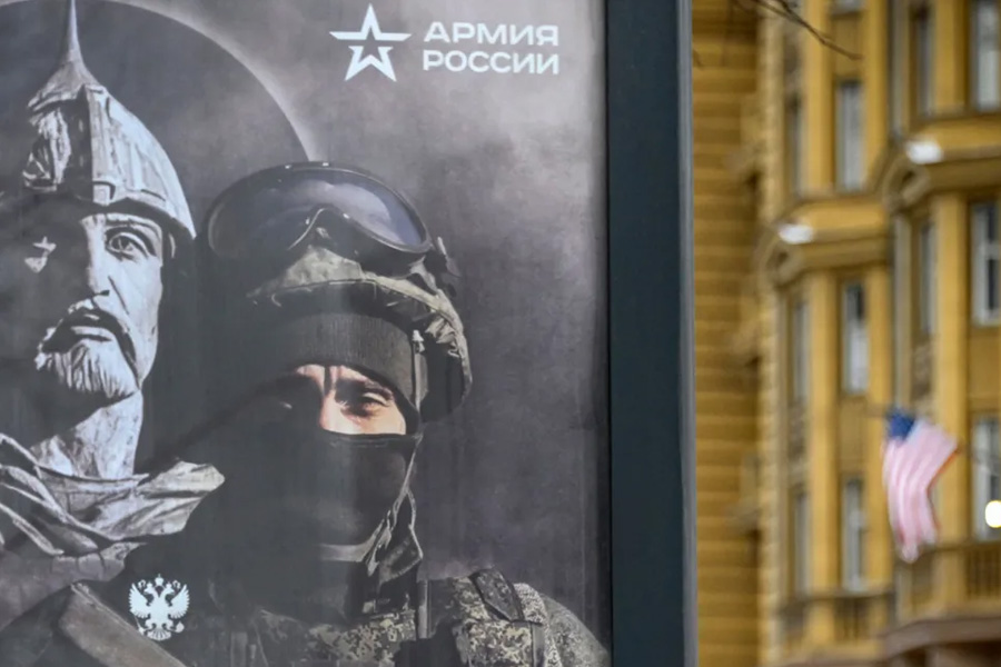 Rossiyadagi AQSh elchixonasi fonidagi banner. Foto: AFP / Scanpix / LETA