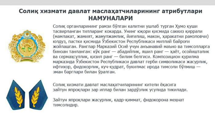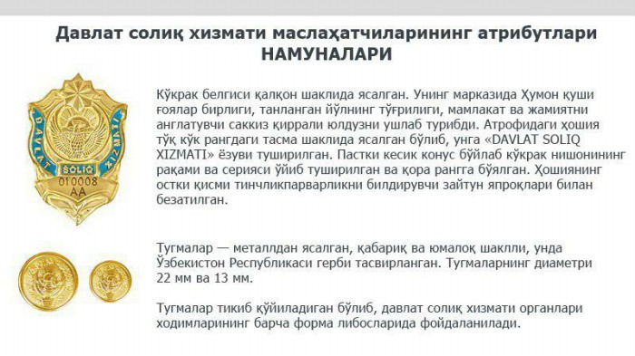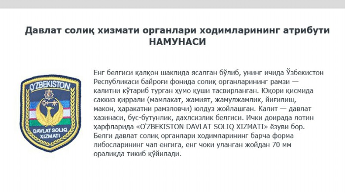 Vazirlar Mahkamasining shu yil 27 iyuldagi «Davlat soliq xizmati organlari mansabdor shaxslarining yangi formali kiyim-bosh va uni farqlovchi belgilarini joriy etish to‘g‘risida»gi 545-sonli qaroriga asosan 2017 yilning 1 sentabridan boshlab davlat soliq xizmati organlari xodimlari uchun yangi namunadagi formali kiyim-boshga o‘tildi.