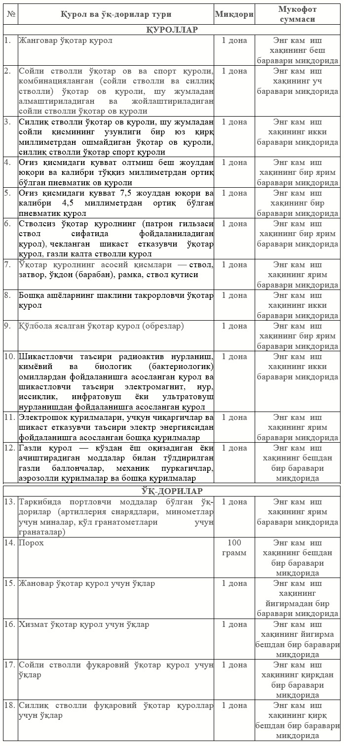 Vazirlar Mahkamasining qarori loyihasiga ko‘ra, O‘zbekiston Respublikasi Jinoyat kodeksining 248-moddasiga muvofiq o‘qotar qurolni va o‘q-dorilarni o‘z ixtiyori bilan topshirgan fuqaro qonun hujjatlarida belgilangan javobgarlikdan ozod qilinadi.
