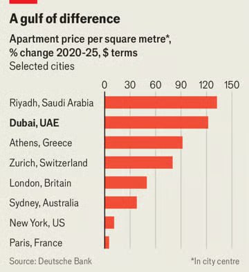 Uy-joy narxlari 2014 yildagi cho‘qqi darajasidan 20 foiz qimmatroq. Yil boshidan avgustgacha bo‘lgan vaqt oralig‘ida umumiy ko‘chmas mulk savdolari 441 milliard dirhamni (120 milliard dollar) tashkil etdi — bu 2024 yilning shu davriga nisbatan uchdan bir qismga ko‘p. Rekord darajadagi ko‘rsatkichlar tez orada narxlarning to‘g‘rilanishi haqidagi ogohlantirishlar va ortiqcha taklifdan xavotirlarni keltirib chiqaryapti. The Economist’ning yozishicha, ayni paytdagi bezovtalik oshirib yuborilgandek ko‘rinadi: talab barqaror, quruvchilar intizomli bo‘lib qolishgan. BAAning ko‘chmas mulk bozori nihoyat «ulg‘aygan».