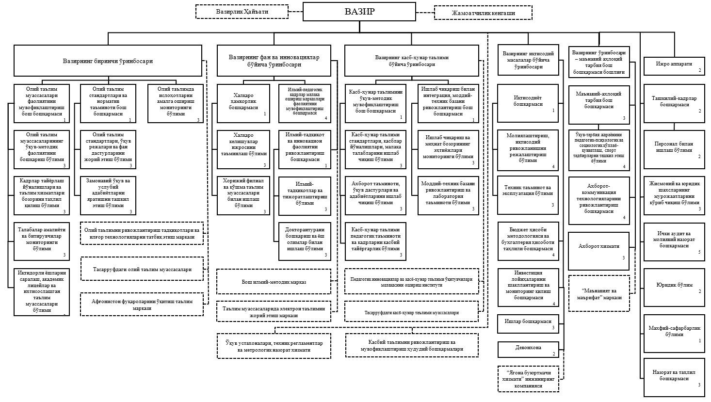 Hujjat bilan O‘zbekiston Respublikasi Oliy va o‘rta maxsus ta'lim vazirligining tashkiliy tuzilmasi; O‘zbekiston Respublikasi Oliy va o‘rta maxsus ta'lim vazirligi markaziy apparatining tuzilmasi; O‘zbekiston Respublikasi Oliy va o‘rta maxsus ta'lim vazirligining Kasbiy ta'limni rivojlantirish va muvofiqlashtirish hududiy boshqarmalari namunaviy tuzilmasi; respublikada oliy ta'lim sifatini tubdan takomillashtirish bo‘yicha kompleks chora-tadbirlar tasdiqlanishi mumkin.