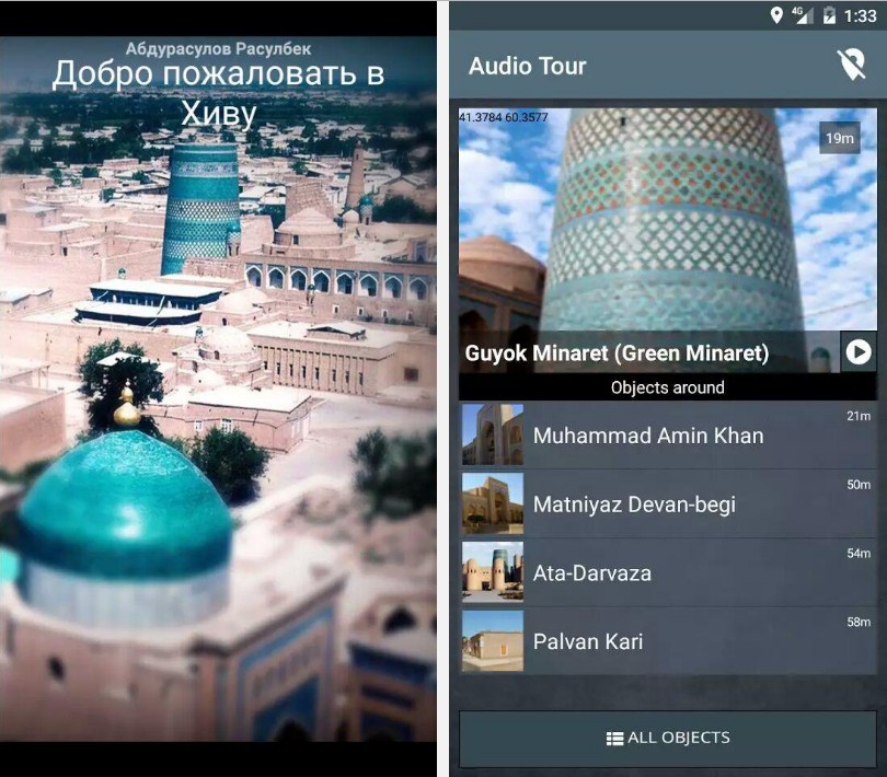 Khiva Audio Tour GPS navigator tizimiga ulangan. Mobil ilova avtomatik ravishda tarixiy obektlarni aniqlaydi va ma'lumotlarni taqdim qiladi, ya'ni, “Ichan qal'a” majmuasidagi ma'lum bir tarixiy obektga yaqinlashganda GPS navigator tizimi orqali obektni tanib oladi va ma'lumotlar audio shaklida yangray boshlaydi.