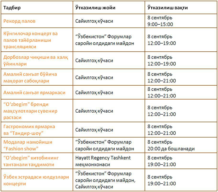 Festival dasturi bilan quyidagi jadval orqali tanishing: