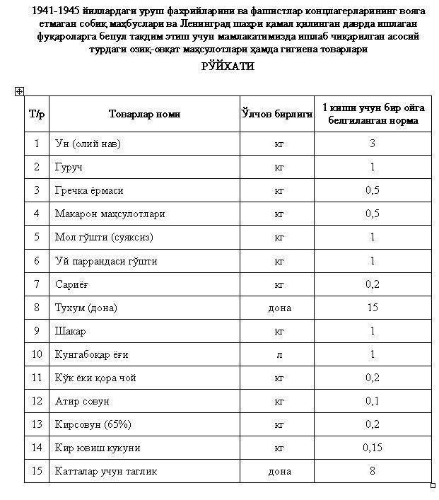 Unga ko‘ra, 2018 yil 1 maydan e'tiboran har oyning 15-sanasiga qadar bir kishiga 3 kg un, 1 kg guruch, 500 g grechka yormasi, 500 g makaron, 1 kg lahm go‘sht, 1 kg parranda go‘shti, 200 g sariyog‘, 15 dona tuxum, 1 kg shakar, 1 litr yog‘, 200 g choy, 100 g atir sovun, 200 g xo‘jalik sovuni, 150 g kir yuvish kukuni, 8 dona taglik beriladi.