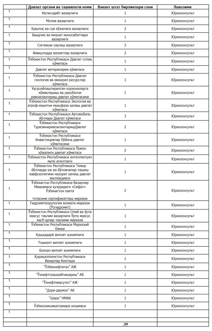 Ishga kirish uchun ushbu vakant ish o‘rinlari mavjud bo‘lgan tegishli davlat organlari va tashkilotlariga to‘g‘ridan to‘g‘ri yoki Adliya vazirligiga murojaat etishingiz mumkin.