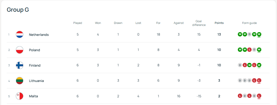 Niderlandlarning guruhdagi ta’qibchilaridan biri Finlandiya Litva bilan o‘yinda iroda ko‘rsatib, JCh yo‘llanmasi uchun kurashda qoladigan bo‘ldi. Ikkinchi bo‘lim boshida Kellmanning hisobni tenglashtiruvchi goli avvaliga ofsayd tufayli hisobga olinmagandi, ammo videotakrordan keyin to‘p unga raqibdan kelgani ma’lum bo‘ldi. Ko‘p o‘tmay Adam Marxiyev g‘alaba golini urdi. Finnlar safida sentabr oyida debyut qilgan ushbu yosh futbolchi uchinchi o‘yiniga kelib gollar hisobini ochdi, uning uncha kuchli bo‘lmagan, ammo aniq bo‘lgan zarbasidan keyin to‘p yuqori burchakka borib tushdi.