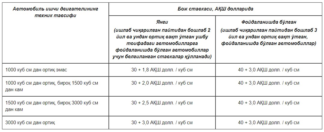 Import bojxona bojlari va aksiz solig‘i stavkalari Prezidentning 29.09.2017 yildagi «O‘zbekiston Respublikasining tashqi iqtisodiy faoliyatini yanada tartibga solish chora-tadbirlari to‘g‘risida»gi PQ–3303-son qarorida belgilangan. Quyida sig‘imi 10 kishigacha bo‘lgan yengil avtomobillar uchun stavkalari keltiriladi.