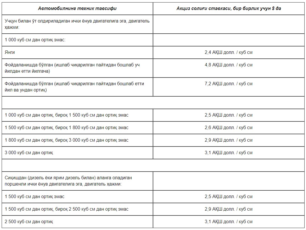 Aktsiz solig‘i stavkalari ham avtomobil dvigatelining texnik tavsiflari va avtomobilning yangiligiga bog‘liq. Quyidagi jadvalda farqi yaqqol ko‘rinadi.