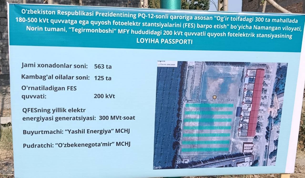 Tuman hokimiga ko‘ra, haqiqatan ham Tegirmonboshi mahallasida futbol maydonchasi o‘rnida quyosh elektr stansiyasi qurilishi rejalashtirgan.