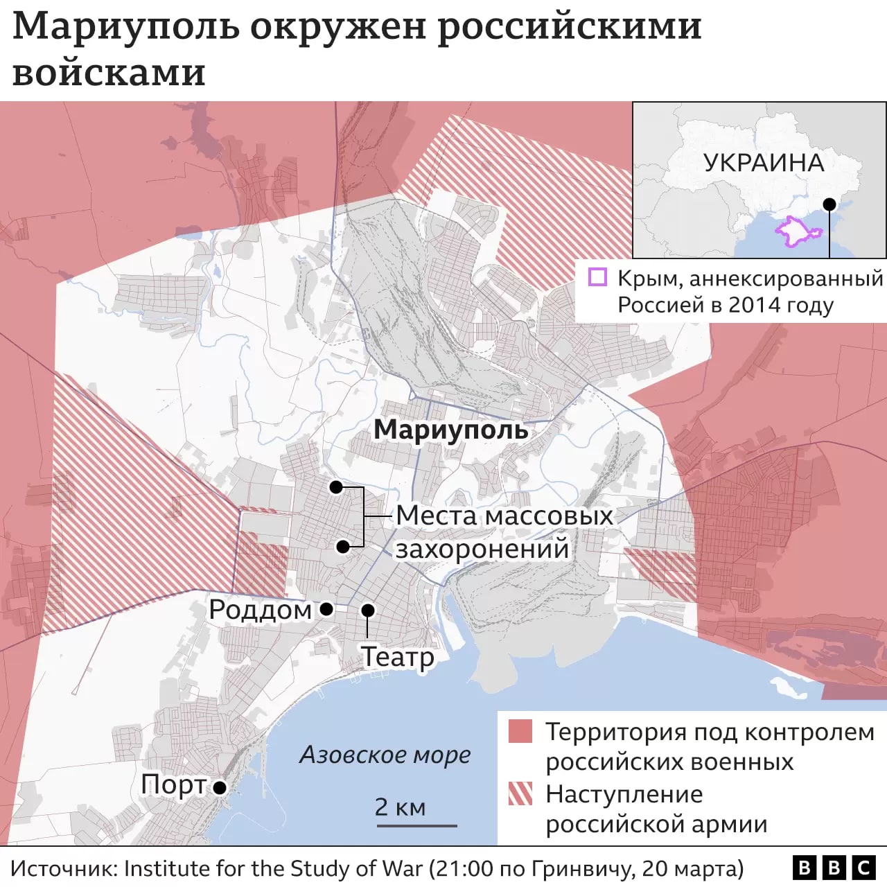 Ukraina hukumati ma’lumotiga ko‘ra, rossiyalik harbiylar shahardagi aholi infratuzilmalariga zarba berishda davom etmoqda: o‘tgan haftada Mariupol dramatik teatri o‘qqa tutildi, u yerda yuzlab kishilar boshpana topgandi. Rossiya qurolli kuchlari avvalroq shahardagi tug‘uruqxona binosiga zarba bergan va bu «Azov» bataloni bazasiga aylantirilganini iddao qilgandi.
