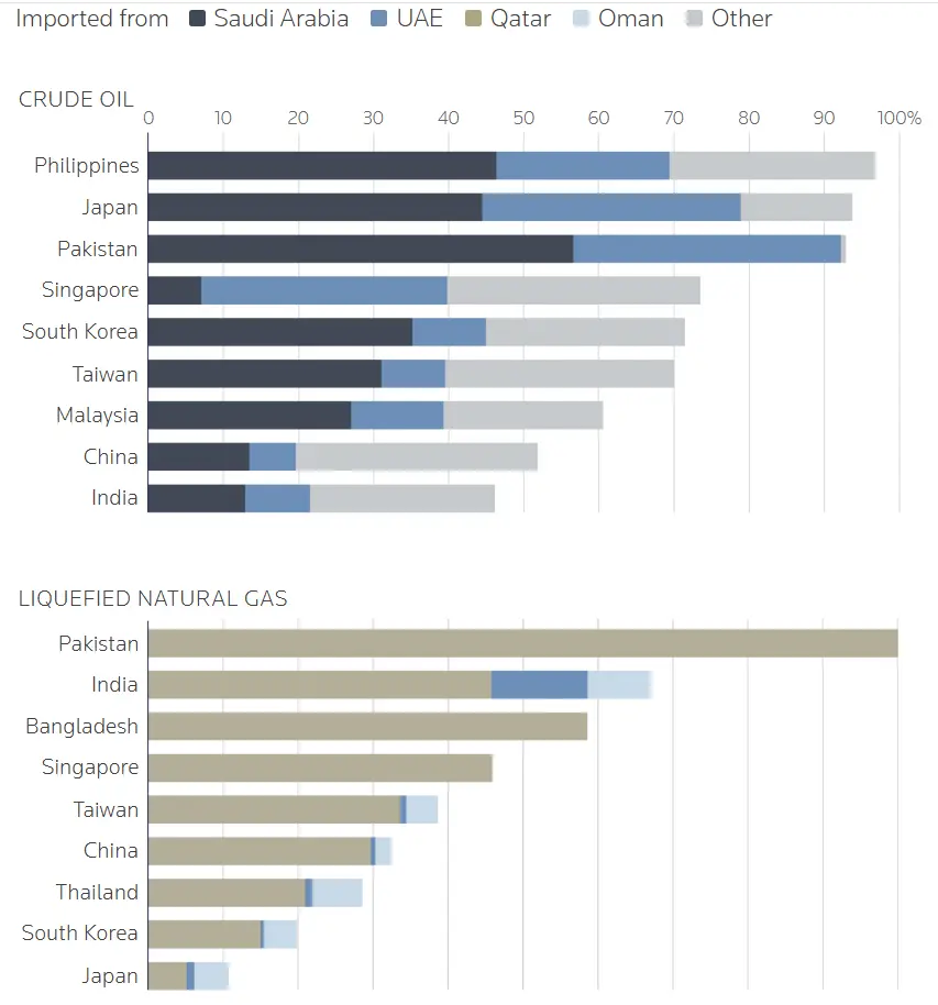Urushdan oldin Ho‘rmuz bo‘g‘ozi orqali o‘tadigan neftning taxminan 80 foizdan ko‘proq qismi Osiyo mamlakatlariga yo‘naltirilgan. Suv yo‘lining yopilishi esa bir qator mamlakatlarni strategik jihatdan juda zaif holatga keltirib qo‘ydi. Masalan, Yaponiya va Janubiy Koreya iqtisodiyoti import qilingan xomashyoni qayta ishlash va tayyor mahsulot eksporti asosiga qurilgan. Urush boshlanishiga qadar Yaponiya neftning 90 foizdan ortig‘ini, Janubiy Koreya esa 70 foizdan ortig‘ini Fors ko‘rfazidan import qilardi. Energetika narxlarining oshishi ushbu davlatlarda ishlab chiqarish tannarxining keskin oshishi va eksport raqobatbardoshligining pasayishiga olib kelishi mumkin.