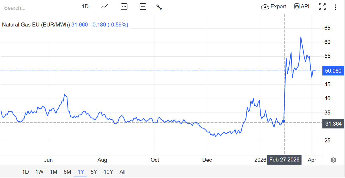 Gaz bilan bog‘liq vaziyat yanada dramatik tus olgan. Qatardagi infratuzilmaning vayron bo‘lishi va Ho‘rmuz bog‘ozining yopilishi sababli Yevropa bozorida narxlar mojarodan oldingi davrga nisbatan 45 foizga ko‘tarilgan. Bu esa qit’ada inflatsiya o‘sishi hamda iqtisodiyotlarning turg‘unlashuvi xavfini oshiryapti. Ayniqsa, Germaniya va Italiya kabi sanoatga tayangan davlatlar korxonalarning ommaviy yopilishi xavfi ostida qoldi.