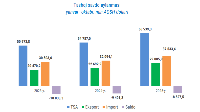2025 yil yanvar-oktabr oylarida O‘zbekistonning tashqi savdo aylanmasi 66,5 mlrd dollarni tashkil etdi. Bu 2024 yilning mos davriga nisbatan 11,7 mlrd dollarga yoki 21,5 foizga ko‘p.