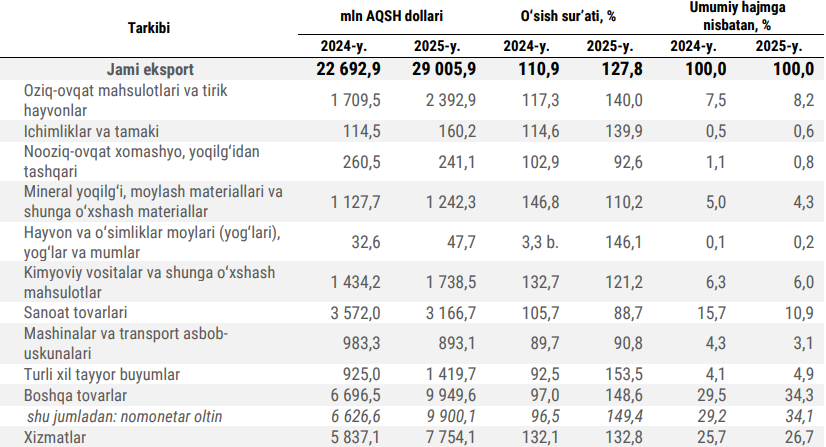 Hisobot davrida 9,9 mlrd dollarlik (+49,4 foiz) oltin sotilgan. Bu umumiy eksportning 34,1 foizini tashkil etadi. Shuningdek, eksport tarkibida sanoat tovarlari (10,9 foiz), oziq-ovqat mahsulotlari va tirik hayvonlar (8,2 foiz), kimyoviy vositalar (6 foiz), turli xil tayyor buyumlar (4,9 foiz) va mineral yoqilg‘ilar (4,3 foiz) ham sezilarli ulushga ega bo‘lgan.