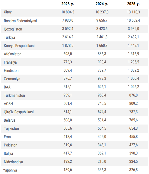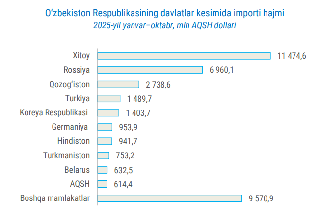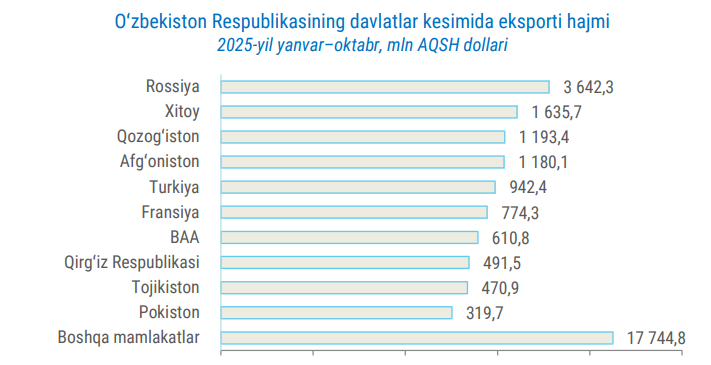 2025 yilning 10 oyida O‘zbekistonning tashqi savdo aylanmasi 66,5 mlrd dollarni tashkil qildi. Bunda Xitoyning ulushi – 19,7 foizga yetdi. Xususan, ushbu mamlakatga eksport 4,9 foizga yoki 1,63 mlrd dollargacha qisqargan bo‘lsa, import hajmi 34,7 foizga yoki 11,5 mlrd dollargacha ko‘paygan. Shuningdek, BAA bilan umumiy savdo 1 mlrd dollardan oshdi. Bu o‘tgan yilning mos davriga nisbatan 2 barobar yuqori ko‘rsatkich.