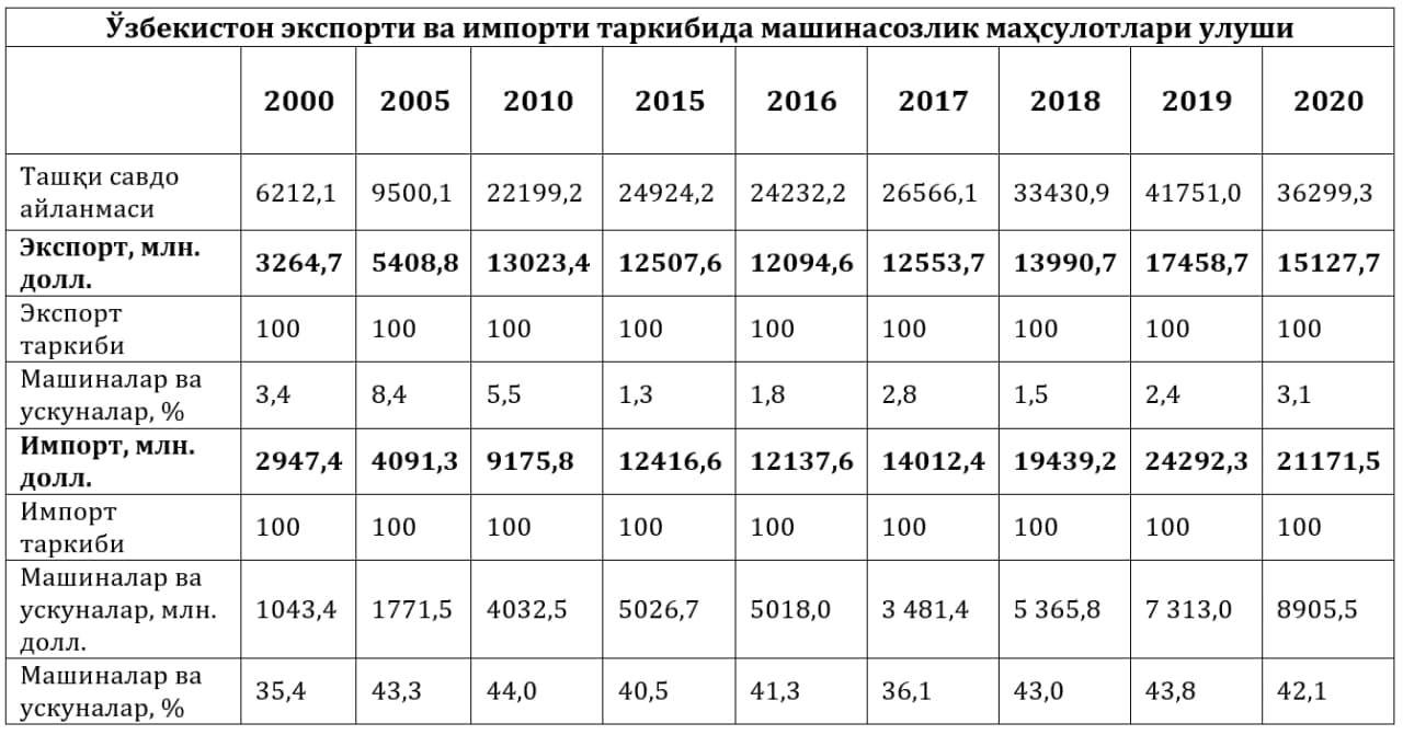 Сўнгги 2020 йилда импорт таркибида машинасозлик маҳсулотлари ҳажми 2017 йилга нисбатан 2,5 бараварга ошган ва деярли 9 млрд долларни ташкил этган. Агарда мамлакатимизда енгил саноат, озиқ-овқат саноати, қурилиш ва қишлоқ хўжалиги, кимё саноати, транспорт машинасозлиги, электротехника саноатлари интенсив ривожланаётганини ҳисобга олсак, импорт қилинаётган аксар машинасозлик маҳсулотлари мана шу тармоқларга тегишли эканини хулоса қилиш қийин эмас ва ушбу ускуналар нархининг қимматлиги юқорида келтирилган тармоқлар маҳсулотининг таннархи юқорилигига, бандликни таъминлашга салбий таъсир кўрсатмоқда.