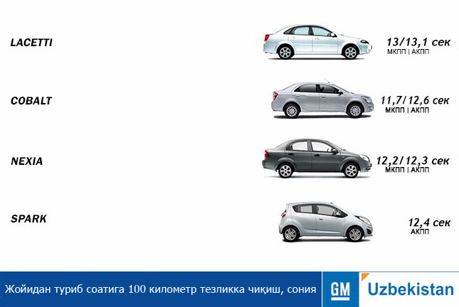 “Сиз ўзингизга GM Uzbekistan ишлаб чиқарадиган автомобиллардан қайси бири тезроқ тезлик олади деган саволни берганмисиз? Эътиборингизга, автомобиллар ва улар 100 км/соат тезликка эришадиган вақт кўрсатилган GIF-тасвирни ҳавола этамиз”, - дейилади хабарда.