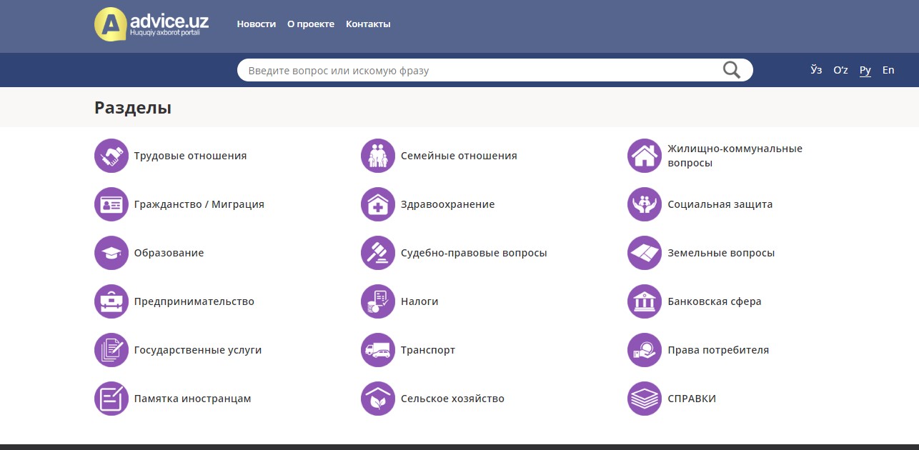 On the website Advice.uz, one can get legal information on topics such as citizenship and migration, government services, consumer rights protection, health care, transport, social security and others. Legal advice can also be obtained through the online consultancy service.