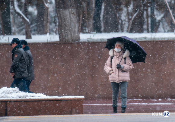 Dense fog and snowfall reduce visibility at Kamchik Pass