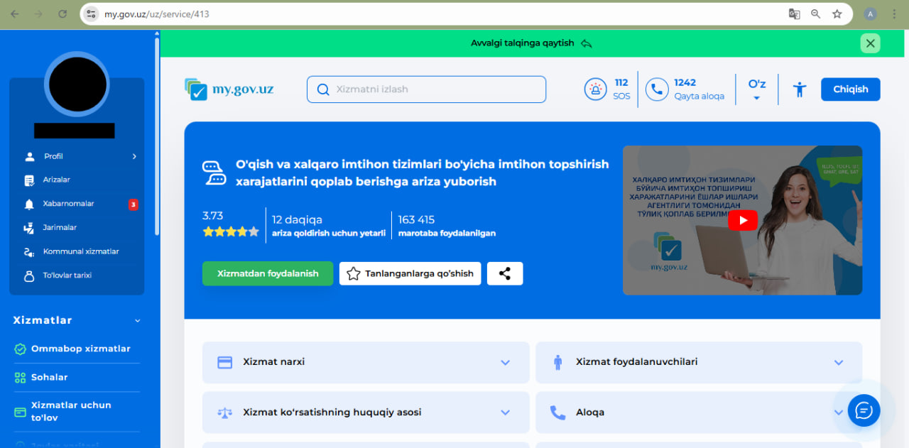 Refunds are processed through the portal my.gov.uz. Log in to your account, select the section “Reimbursement for education and international exams”, and complete the online form.