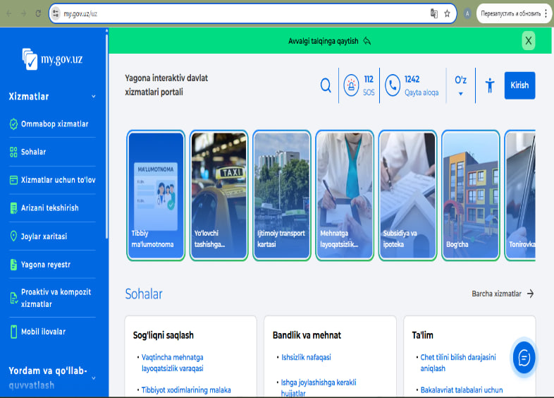 The main page of the my.gov.uz portal. It shows where to click “Log in” to sign in through OneID or MyID.