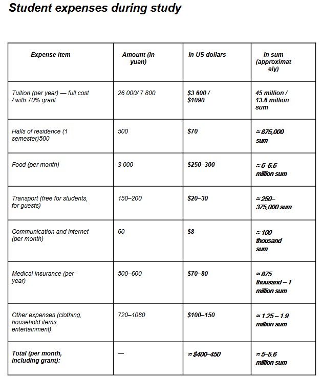 - University Grant - awarded for high IELTS or HSK scores, active participation in competitions, volunteer projects and academic achievements.