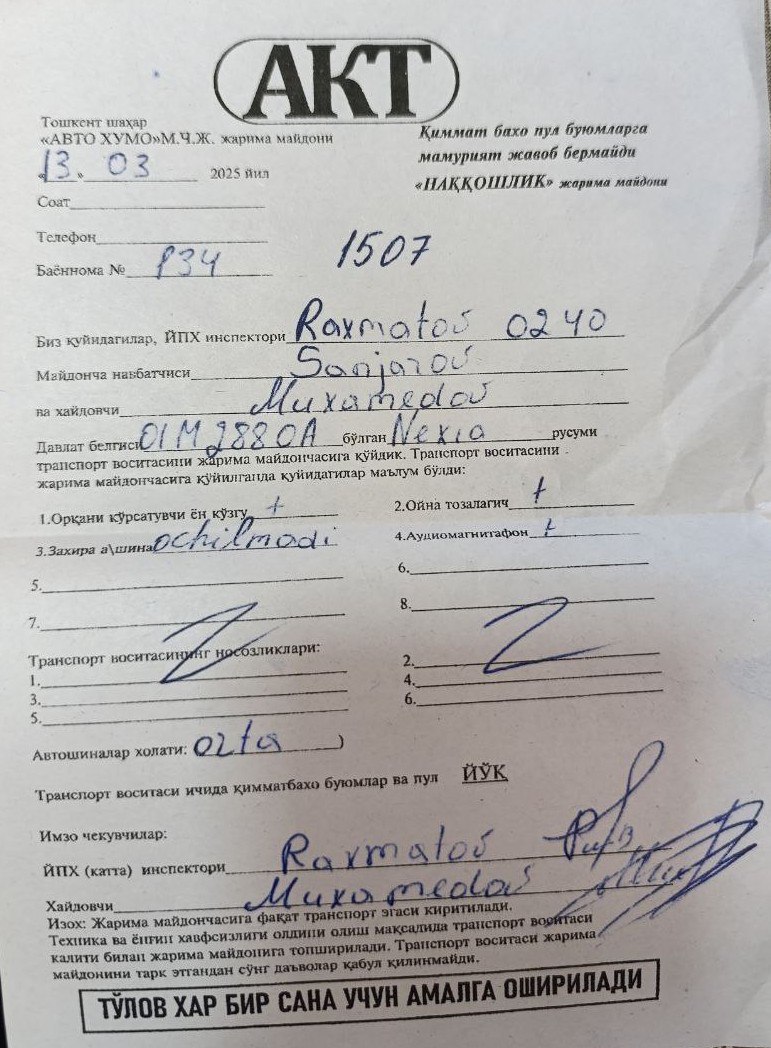 However, be prepared for a fine for not having compulsory motor insurance. Driving without compulsory motor insurance in Uzbekistan is an administrative offence. When your documents are checked (and they will definitely be checked at the scene of the accident), you will be fined 375,000 soums.