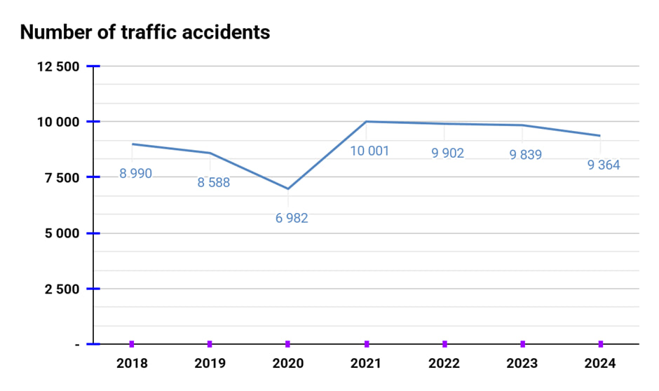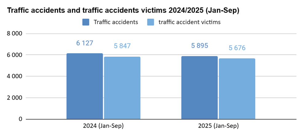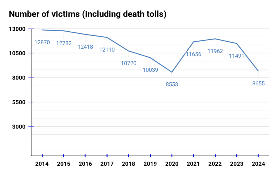 The diagrams track changes in traffic accidents and victims, including both injuries and fatalities, over the past decade. At their peak, annual victim numbers approached 13,000. By contrast, in 2024 – a full reporting year – the figure fell to around 8,600, marking one of the lowest full-year totals in recent records.