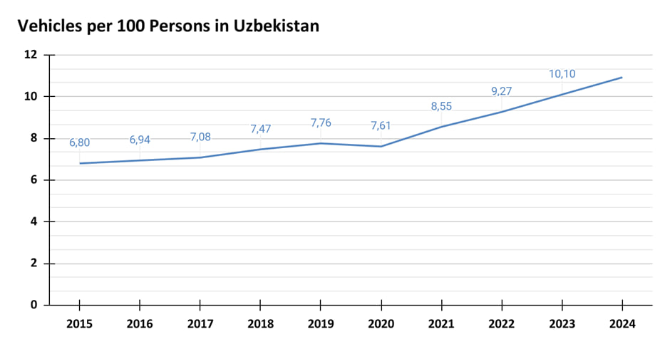 What makes this trend particularly noteworthy is that it has occurred alongside rapid growth in car ownership. In 2015, Uzbekistan had roughly 6–7 cars per 100 people. By 2025, that figure had nearly doubled to around 12 (Figure 6).
