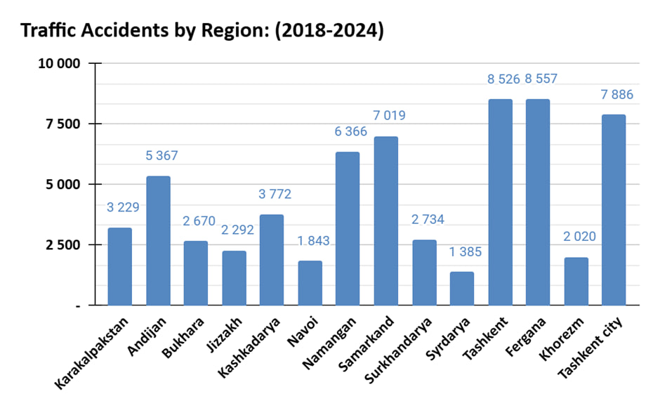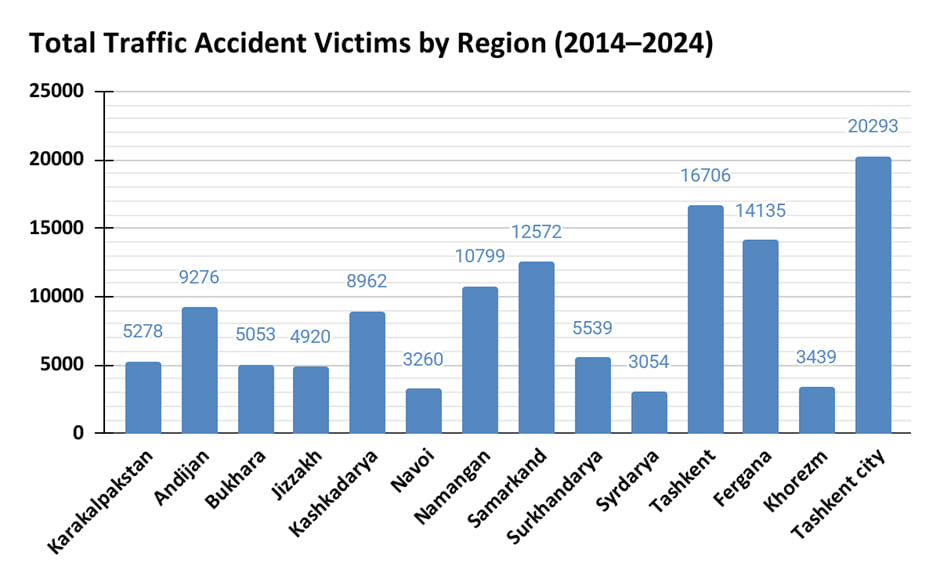 A regional breakdown of total traffic accidents over the past ten years reveals clear and persistent patterns. Tashkent city, Tashkent region, Fergana, and Samarkand consistently record the highest numbers of accidents, making them the country’s primary road safety hotspots.
