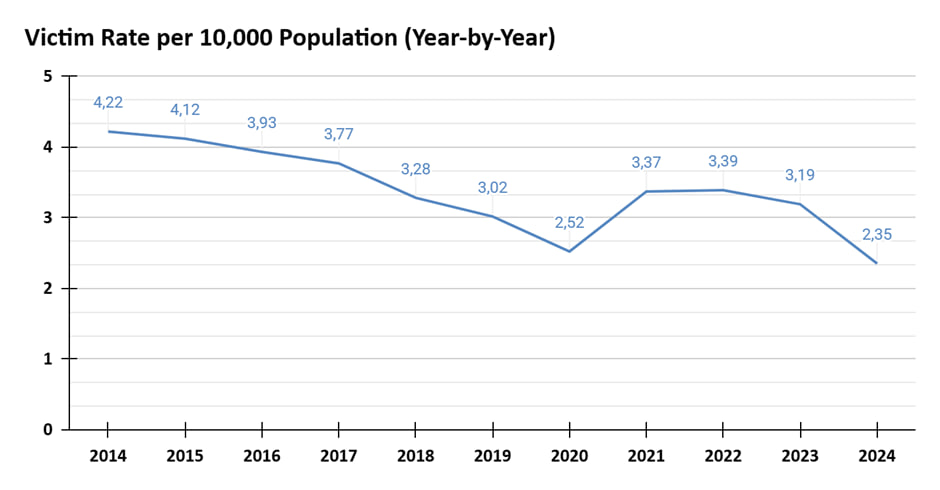 At the national level, however, the victim rate per capita tells a more encouraging story. In 2014, around four out of every 10,000 people were injured or killed in traffic accidents. Over the decade, this figure steadily declined, reaching approximately 2.3 victims per 10,000 people in 2024. While there were temporary increases in some years, the overall trend points to a gradual reduction in individual risk (Figure 7).