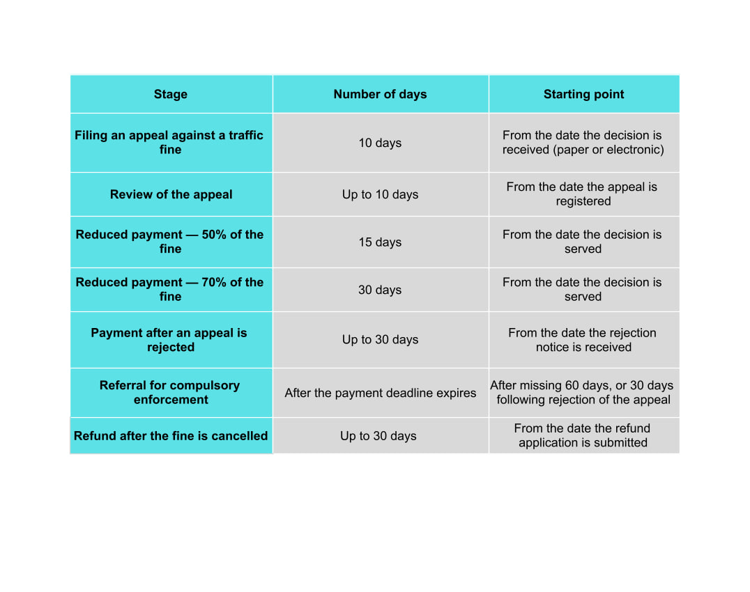 The time limits for appealing a traffic fine are strictly regulated by law. If these deadlines are missed without a valid reason, the appeal may not be considered, even if there are clear errors in the fine.