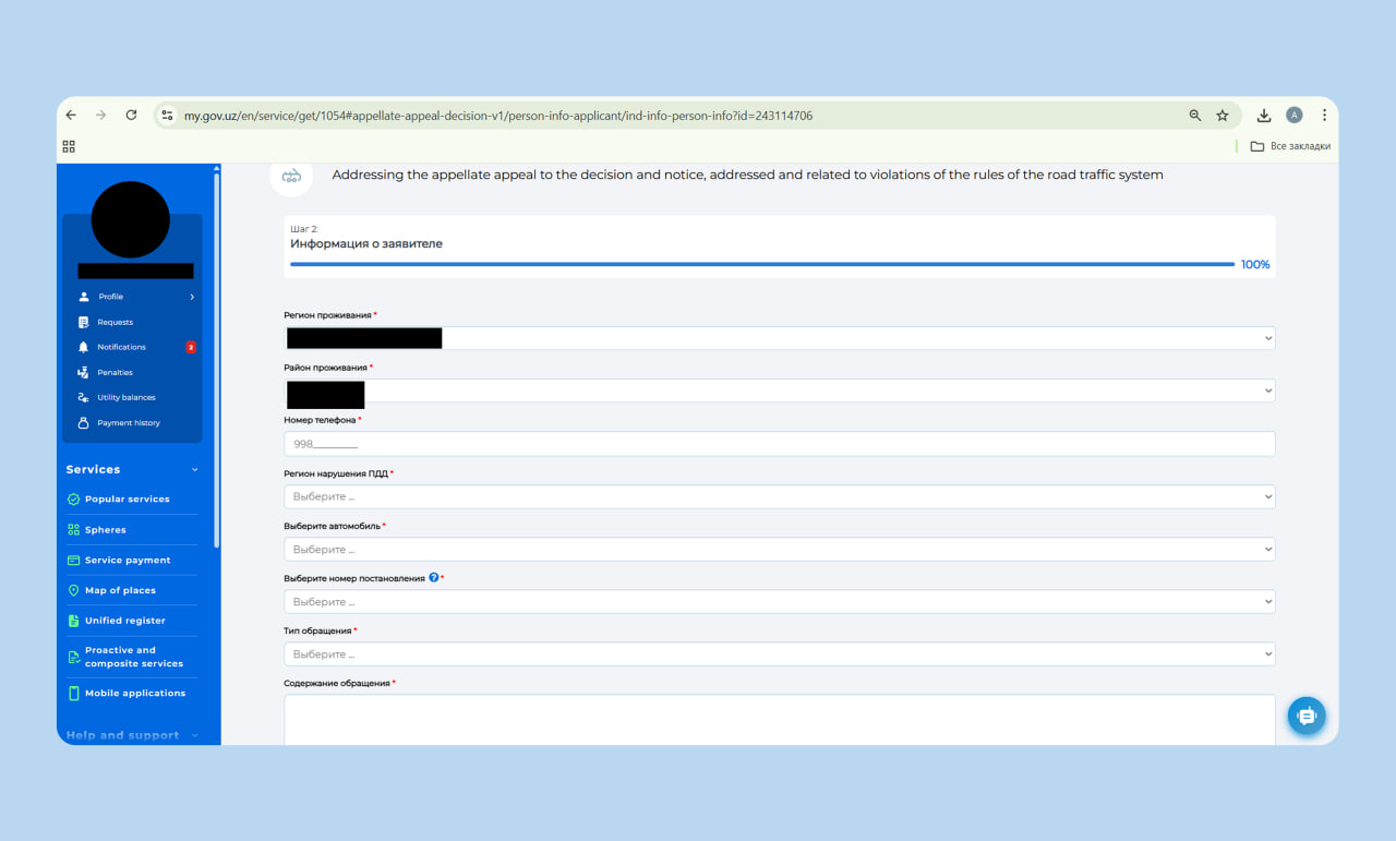Contact details and the region of residence are filled in or verified automatically. This information is used to register the appeal.