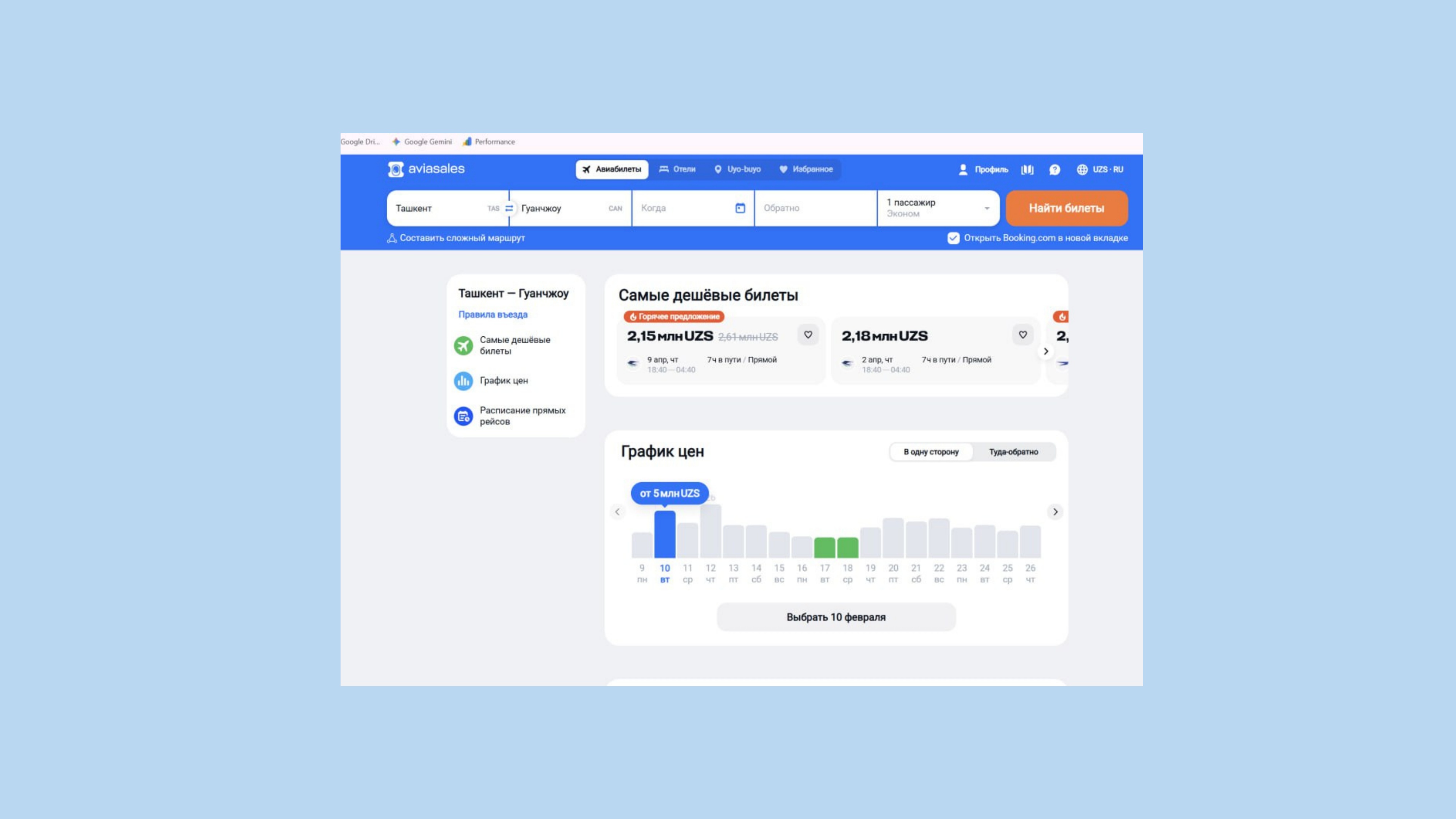 Direct flights and charters also operate to Sanya (Hainan Island), usually 1–2 times per week, more frequently in high season. One-way fares typically start from 2.8 million UZS.