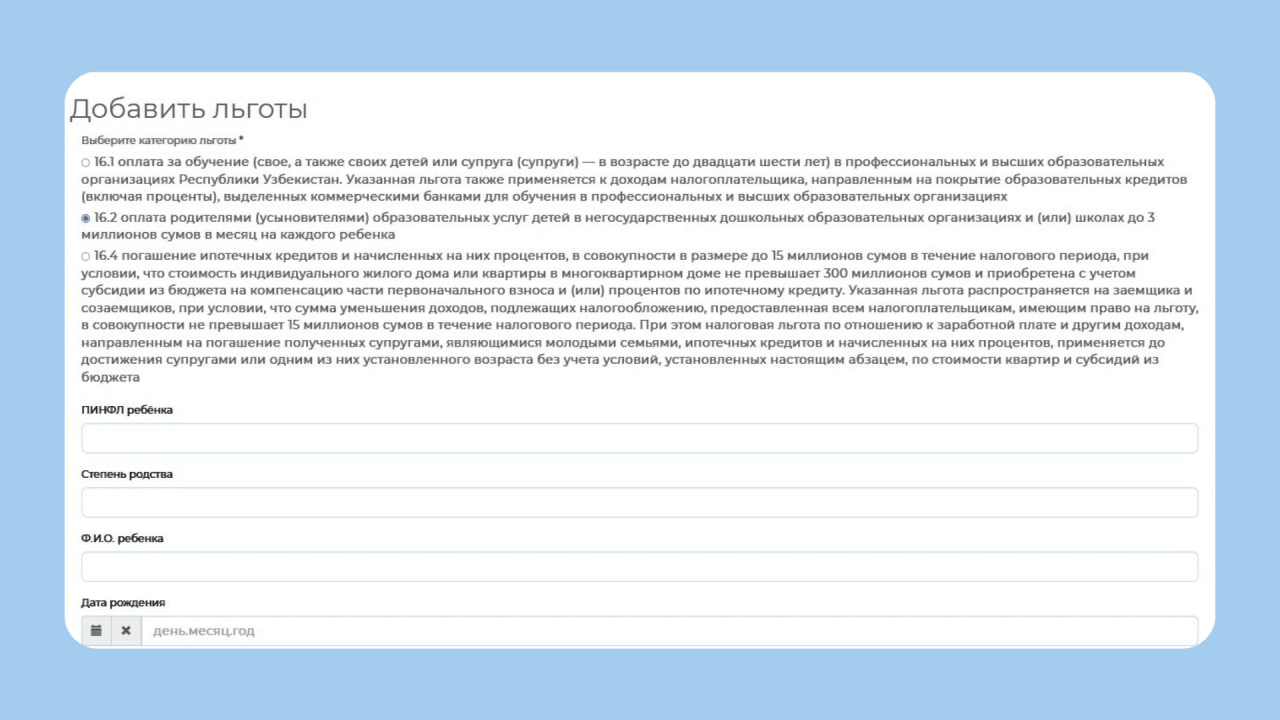 In the table Tax benefits, select 16.2 — payment by parents (adoptive parents) for children’s educational services. There, also specify the child’s details, where they study, and the contract details.