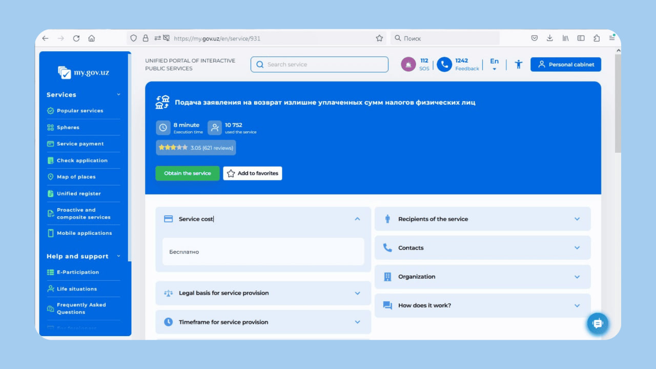 Request a benefit with a service called «Подача заявления на возврат излишне уплаченных сумм налогов физических лиц».