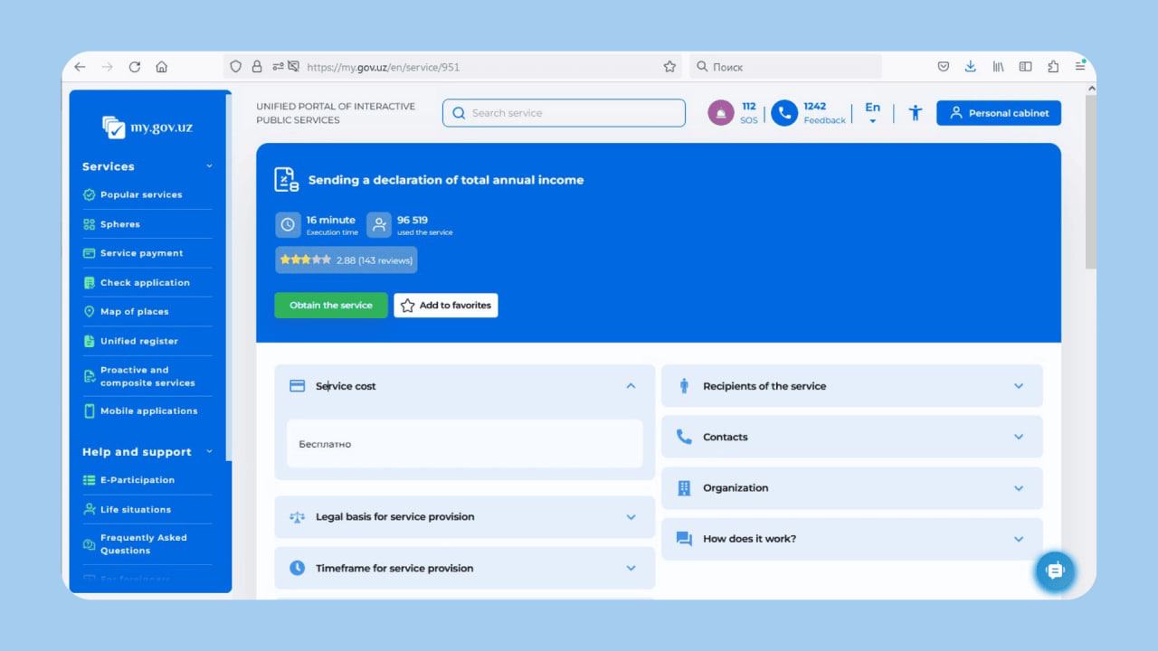 Find the service «Sending of the declaration of total annual income».