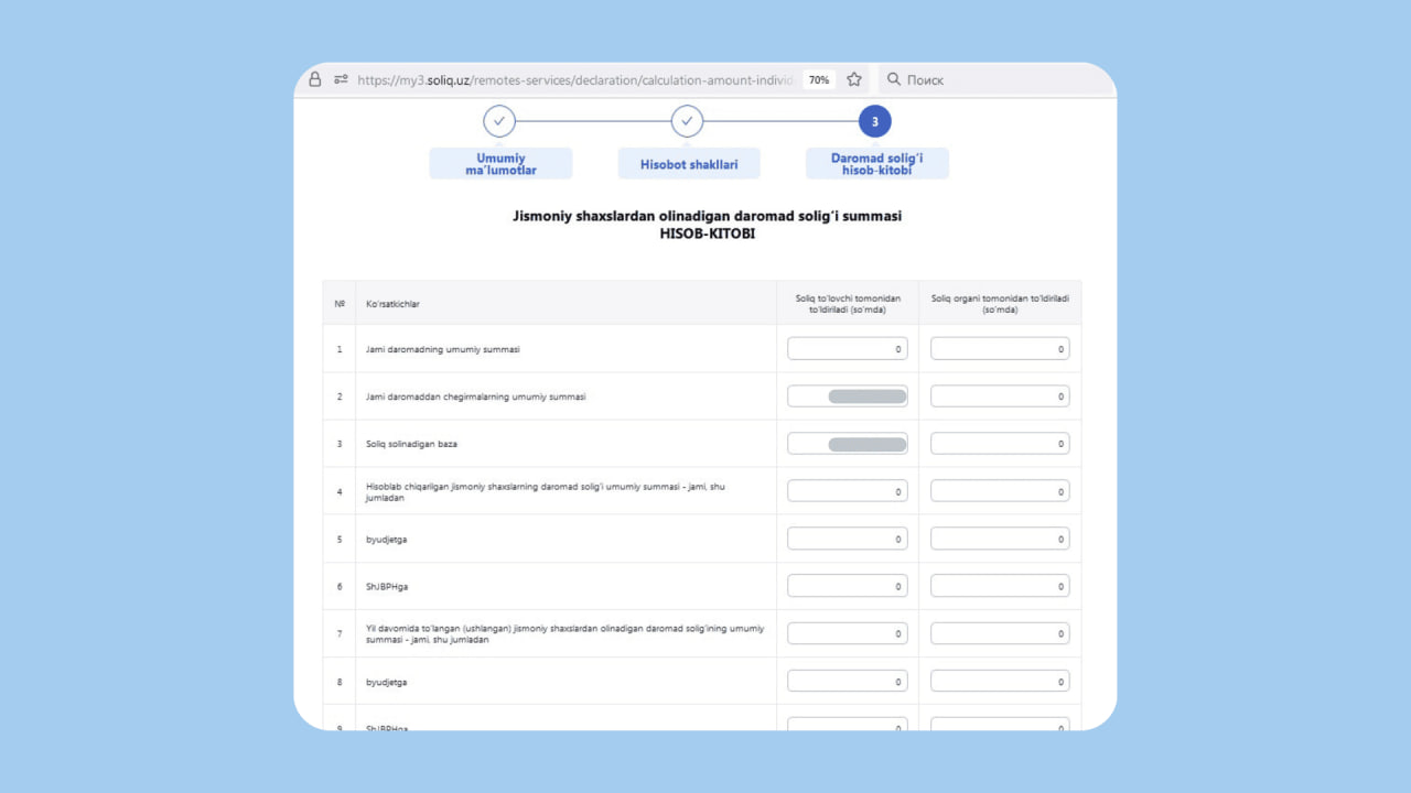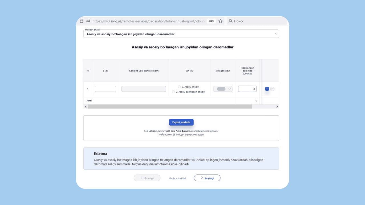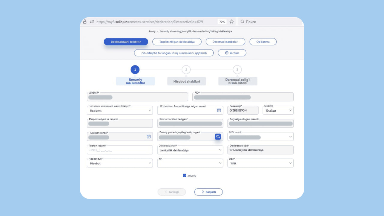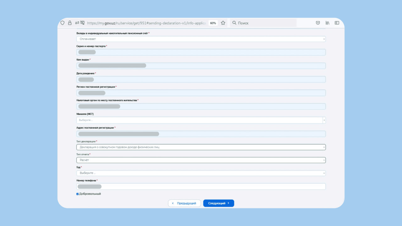 Third step. Specify your mahalla, whether you make pension contributions, the reporting year, your phone number, and the voluntary nature of the report. Declaration type: Declaration of total annual income of individuals. Report type: calculation.