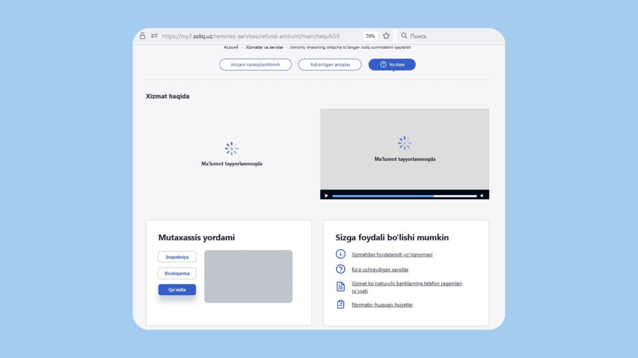 After filling out the declaration, check its status. If it has been successfully accepted, open the service «ЖШ ортиқча тўланган солиқ суммаларини қайтариш». There you will enter your card details: