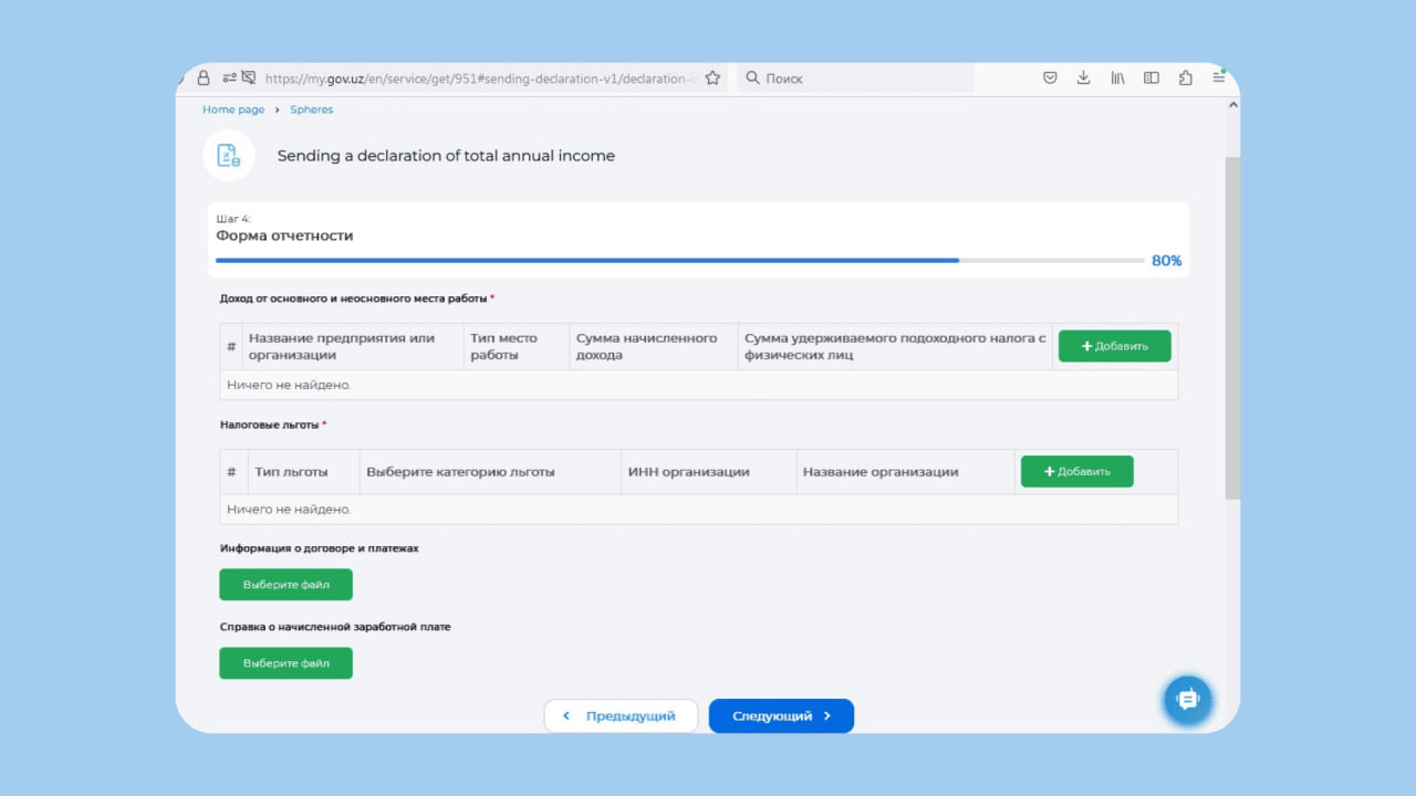 The declaration can be filled out and submitted on the my3.soliq portal. To log in, a digital signature is required. Log in to your profile, open Services for individuals, and select «Declaration of total annual income of individuals».