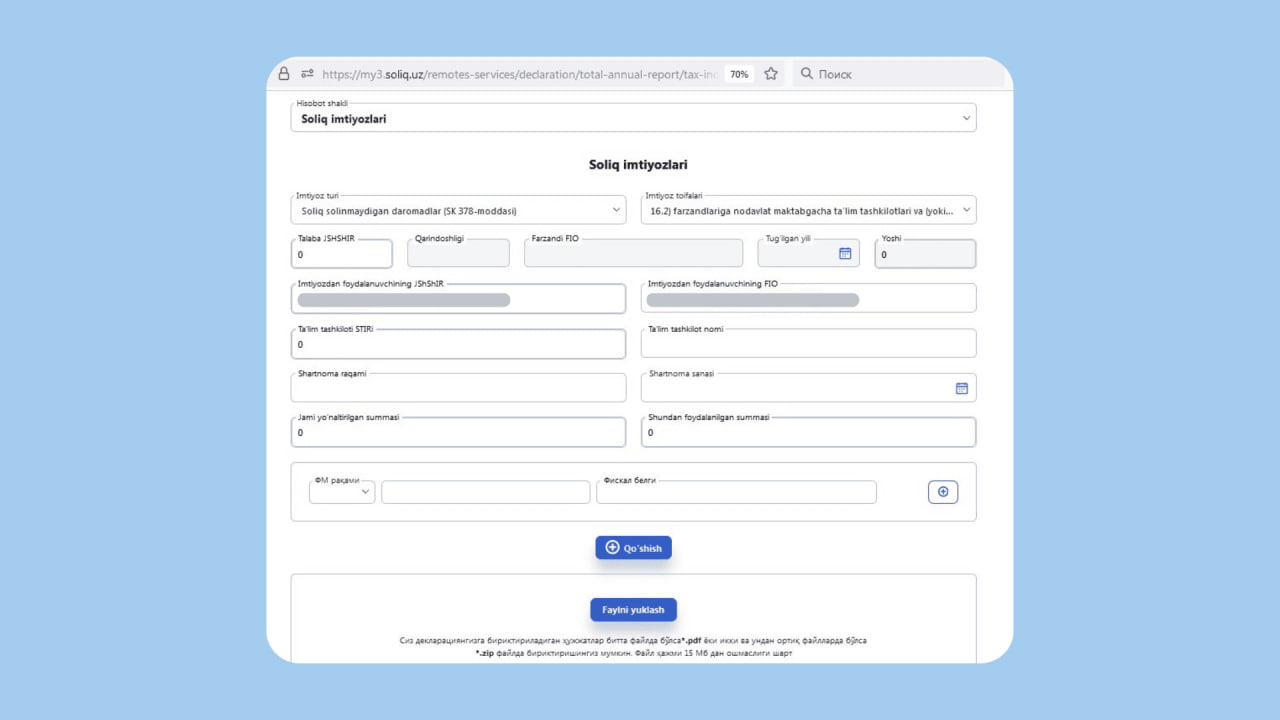 - Type of benefit — income not subject to taxation (Soliq solinmaydigan daromadlar (Article 378 of the Tax Code))