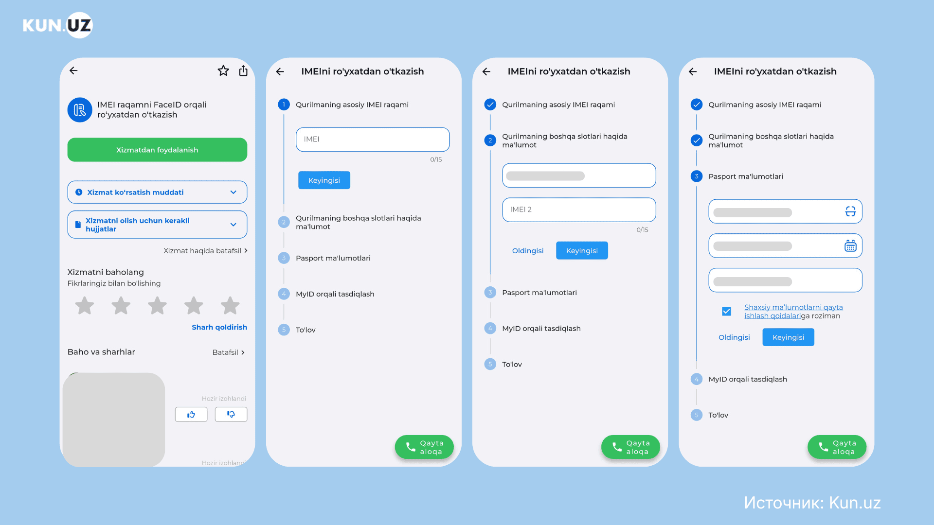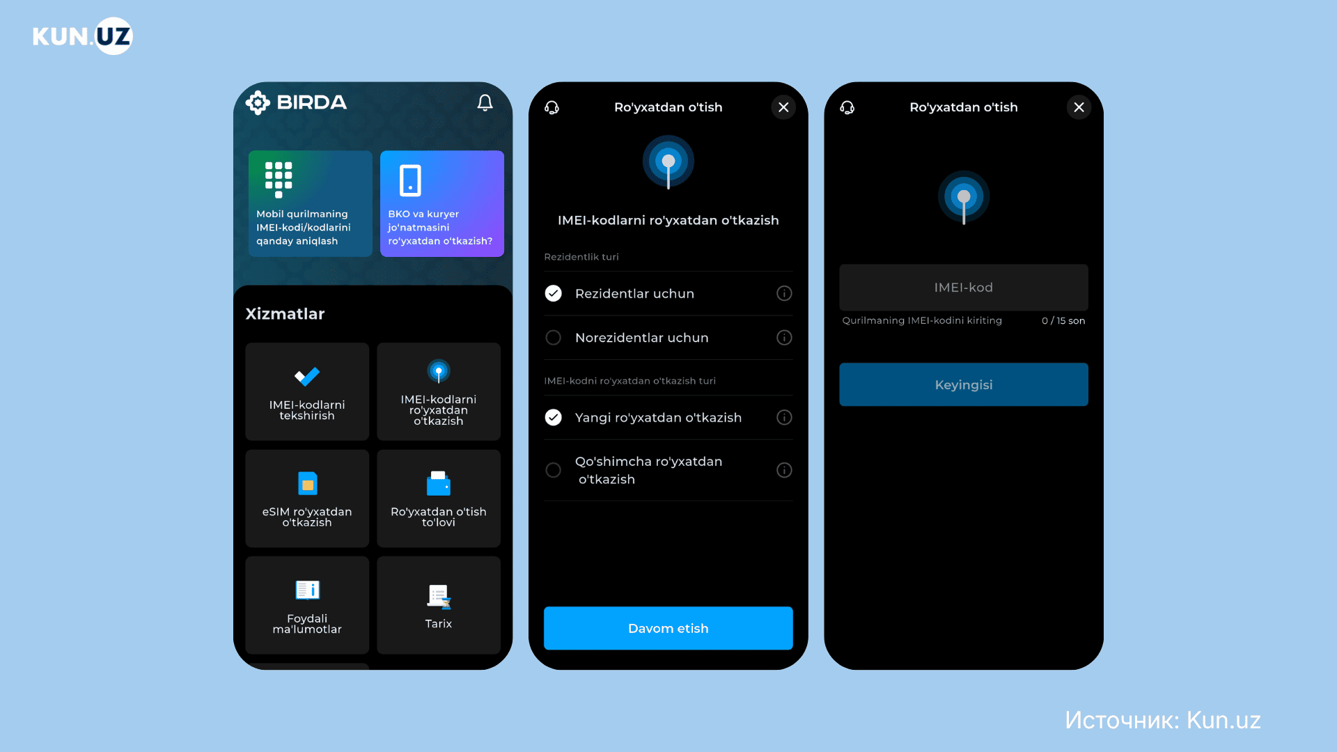 Enter the IMEI codes, your PINFL, date of birth, and passport series and number. Confirm your identity using the camera and pay for registration.