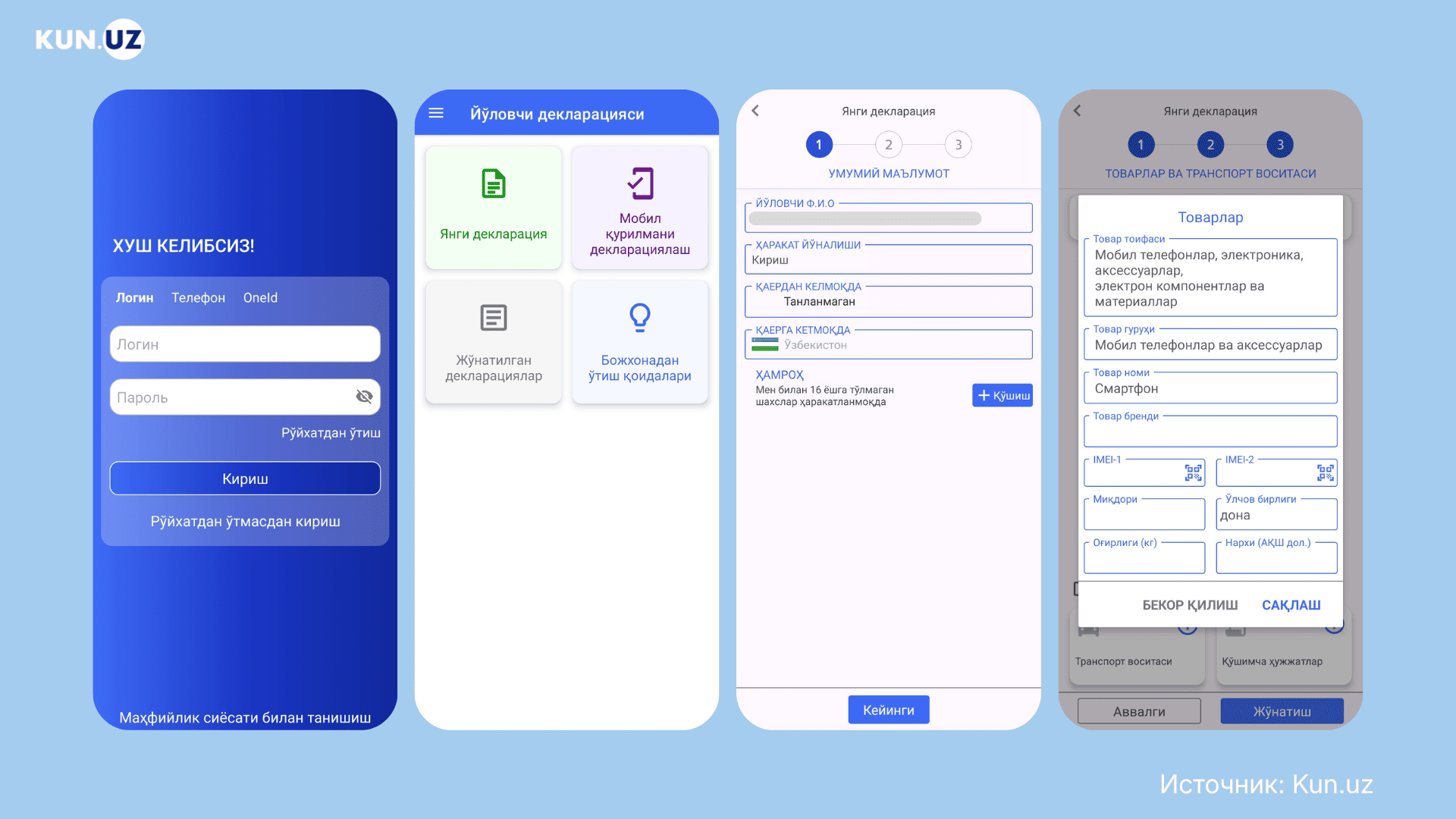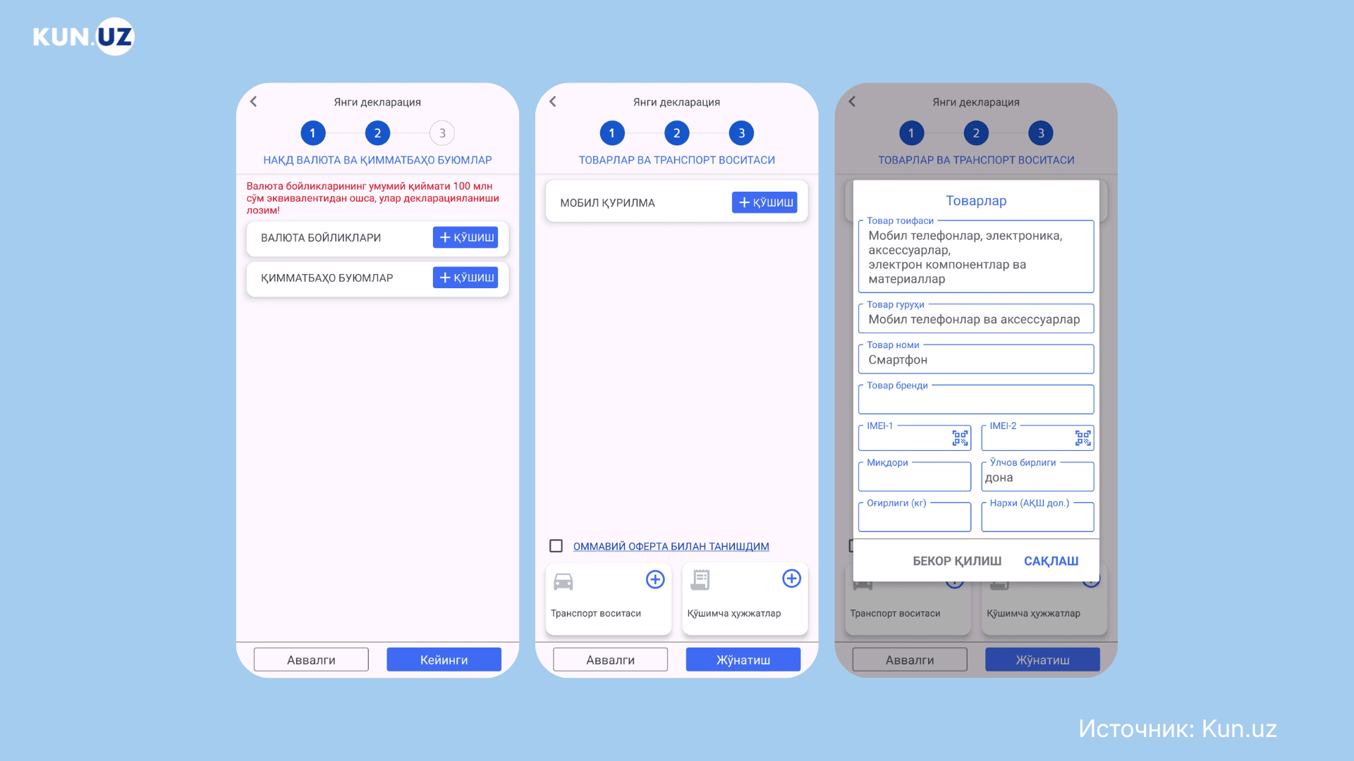 Filling out a customs declaration in the Yo'lovchi deklaratsiyasi app